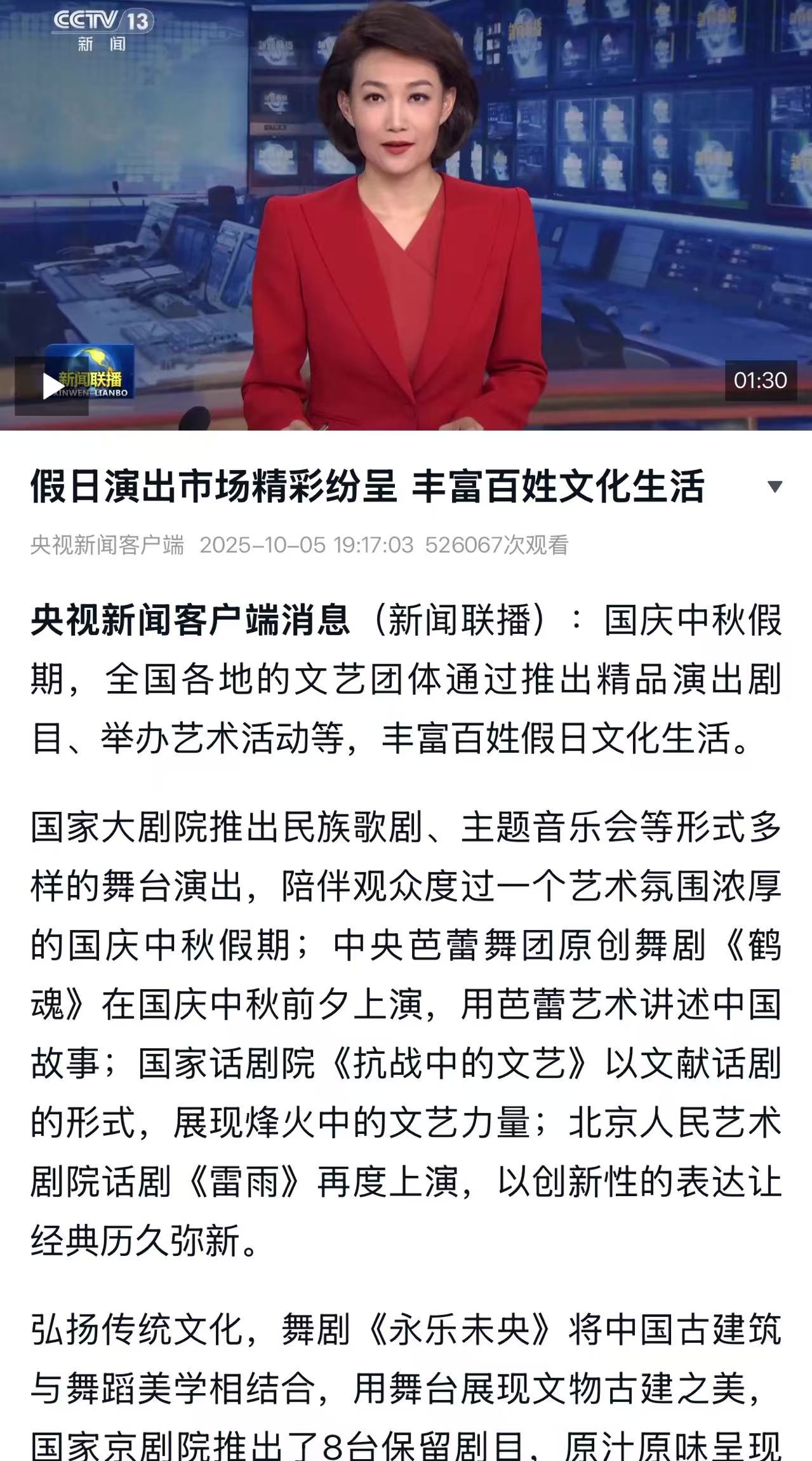 国庆中秋双节,央视《新闻联播》报道中国东方演艺集团《永乐未央》《大江东去》